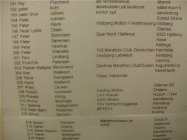 Die Meldeliste war heute mal nach Vornamen geordnet. Sonderzeichen wie Akzent de gü kann die dänische EDV wohl nicht verarbeiten - also stand ich dann mit den Namen "Ren" und "Rene" gleich zweimal in der Liste, hab mich mal für die Nummer 204 entschieden - richtig zum Rennen kam ich aber trotzdem nicht: nur 136. Platz von 218.