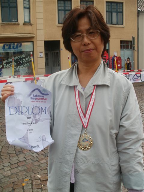 Im Ziel winkten als Belohnung Diplom und Medaille - hier präsentiert von Nachwuchshoffnung Yong-Sook, die heute nach Bad Harzburg ihren zweiten 10er lief - ganz nach der Affenzahntaktik: ohne Training.