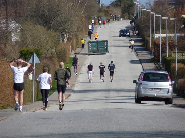 dieser Foto mit Claus Christensen (Läufer links) zeigt deutlich wie steil die Straße ist. Das Foto wurde mit einem Stativ geschossen, welches sonst ganz gerade steht
