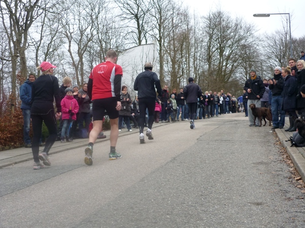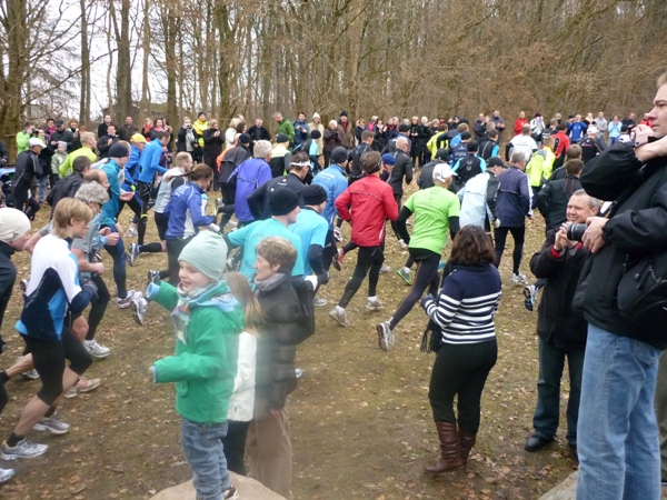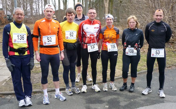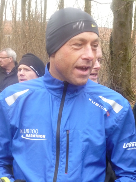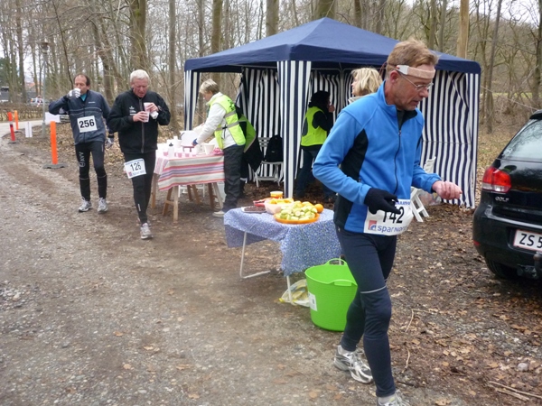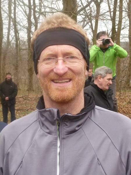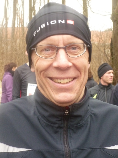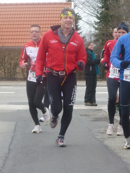 Pünktlich um 13 Uhr wurde bei ca. 5 Grad das Teilnehmerfeld (neuer Teilnehmerrekord mit 218 Startern) gegenüber der Schule in einem kleinen Park gestartet. Ich verbrachte die komplette erste Runde mit dem Fotografieren und lief dabei natürlich extrem unrhythmisch und befand mich teilweise fast am Feldende. Runde zwei wurde dann etwas schneller, ich machte aber weiterhin noch ein paar Fotos. Inzwischen hatte der angekündigte Regen eingesetzt und am Anfang der dritten Runde fing ich dann mit meiner geplanten Aufholjagd an, wurde jedoch schon vor der Rundenhälfte gestoppt, denn plötzlich setzte mein MP 3 Player aus. Also ging ich ein Stück zu Fuß und nahm das gute Stück genau unter die Lupe, denn wie sollte ich den Marathon ohne die Unterstützung von Ian van Dahl, Milk Inc., Sylver, Lasgo, Pet Shop Boys, Saga usw. schaffen? Nachdem ich eine Weile ohne Erfolg beim Gehen an dem Gerät rumgebastelt hatte, beschloss ich bei der nächsten Möglichkeit an meinem Auto noch einmal eine frische Batterie in den MP 3 zu setzen. Also wurde die Laufstrecke im Bereich des Schulparkplatzes verlassen. Der Batteriewechsel und weiteres Tastendrücken brachte auch nicht den erhofften Erfolg, also MP3 Player ins Auto gelegt, den Fotoapparat auch, noch schnell eine Pinkelpause und dann wieder auf die Laufstrecke. Dummerweise waren alle Aktiven, die ich auf den letzten 3 km überholt hatte nun alle wieder vor mir. Die haben sich sicherlich etwas gewundert, dass ich sie plötzlich erneut überholt habe! Ich passierte das Halbmarathonschild nach 2:00:25 Stunden und fasste den Entschluss noch eine Zeit unter 4 Stunden zu laufen. Runde 4 und 5 verliefen dann ohne Probleme und als ich auf dem Schulhof (dem Rundenende) nach der 5 Runde einlief, war 100 MC Vereinskamerad René gerade in die letzte Runde gegangen, sein Vorsprung vor mir lag wohl bei knapp 1:30 Minuten. Damit war mein Jagdinstinkt aber natürlich geweckt. Nach einiger Zeit konnte ich bei einer abknickenden Straße eine erneute Zeitmessung vornehmen. Nur noch 55 Sekunden Vorsprung für René! Nächste Messung ca. 700 Meter weiter ergab einen Abstand von nur noch 40 Sekunden! Die hatte ich dann an einer Steigung im Wald recht schnell weggespielt und konnte René direkt nach dem Waldstück überholen. In der gesamten 6 Runde nervten mich allerdings ständig leichte Krämpfe in den Zehen, zum Glück konnte ich damit bis ins Ziel weiterlaufen, ohne noch einen Stopp zu machen. Endzeit 3:54 Stunden und damit einen gewünschten Hahn/Weber Treffer gelandet!