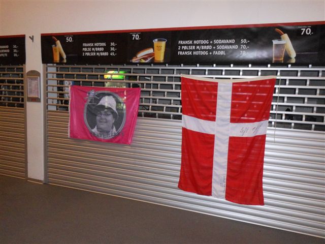 Nachdem wir dann unsere 100 Euro bzw. 750 Kronen gelöhnt hatten, erhielten wir Startnummer und T-Shirt. Christine zeigt uns hier ein Shirt vom ersten Arhus 24er; damals gab die Grafik noch was her. Das diesjährige Hemd (schwarz mit dezentem Aufdruck bzw. Hinweis von welchem Lauf es stammt) konnte man gleich entsorgen bzw. für die nächste Beerdigung reservieren...taugt jedenfalls nicht als Angebershirt.