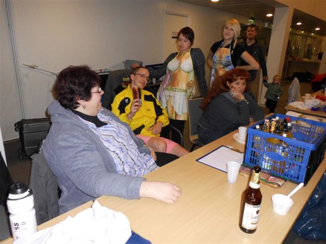 Christine war hauptsächlich der Massage wegen nach Aarhus gekommen. Doch leider gab es diesmal so etwas nicht. Erst im Duschraum sah ich so eine Knetbank. Massagebilder aus 2011 siehe in meinem Bericht vom Januar 2011 (Linkeinfügung an dieser Stelle war mir mal leider wieder nicht möglich, Bericht kann unter "Laufberichte nach Orten" gefunden werden); vielleicht kann ja beim nächsten Mal wieder aktuelleres Massage-Bildmaterial geliefert werden.