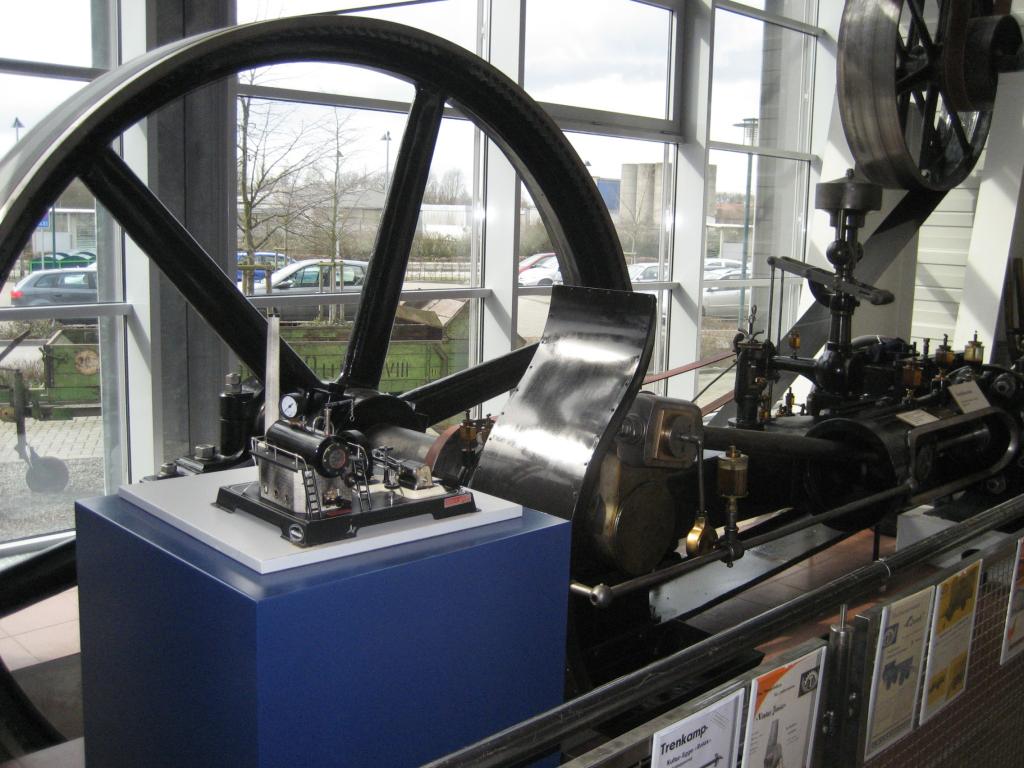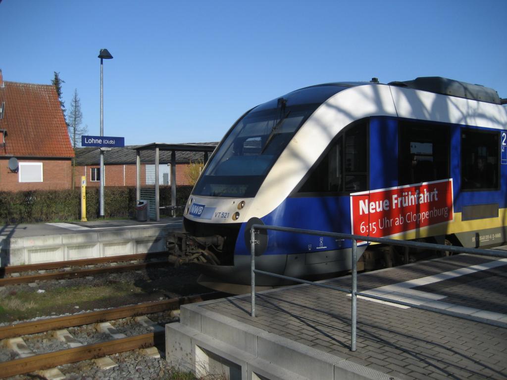 Nach Anschluss der Stadt Lohne an den Eisenbahnverkehr in Richtung Delmenhorst wird 1888 das Bahnhofsgebäude erstellt. Mit einem Sonderzug besucht Bundespräsident Heinrich Lübke 1967 Lohne mit einem Sonderzug. 2001 durch die Stadt erworben wird das Bahnhofsgebäude 2003 an das Musikhaus „Piano Hartz verkauft. Lohne wurde 980 erstmals in einer Urkunde als „Laon“ erwähnt. 1801 begann mit der Massenproduktion von Gänsekiel-Schreibfedern die Industrialisierung. Das Industrie Museum Lohne, das gleich neben der Bahnstation gelegen ist, bietet die Gelegenheit, auf eine kleine Entdeckungsreise zu gehen. Eine Dampfmaschine, Symbol der Industrialisierung, ist im Erdgeschoss zu sehen. Daneben ein Häckseldrescher.