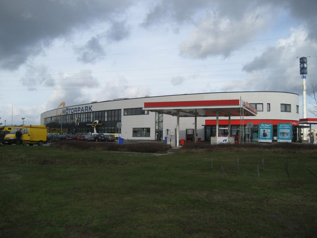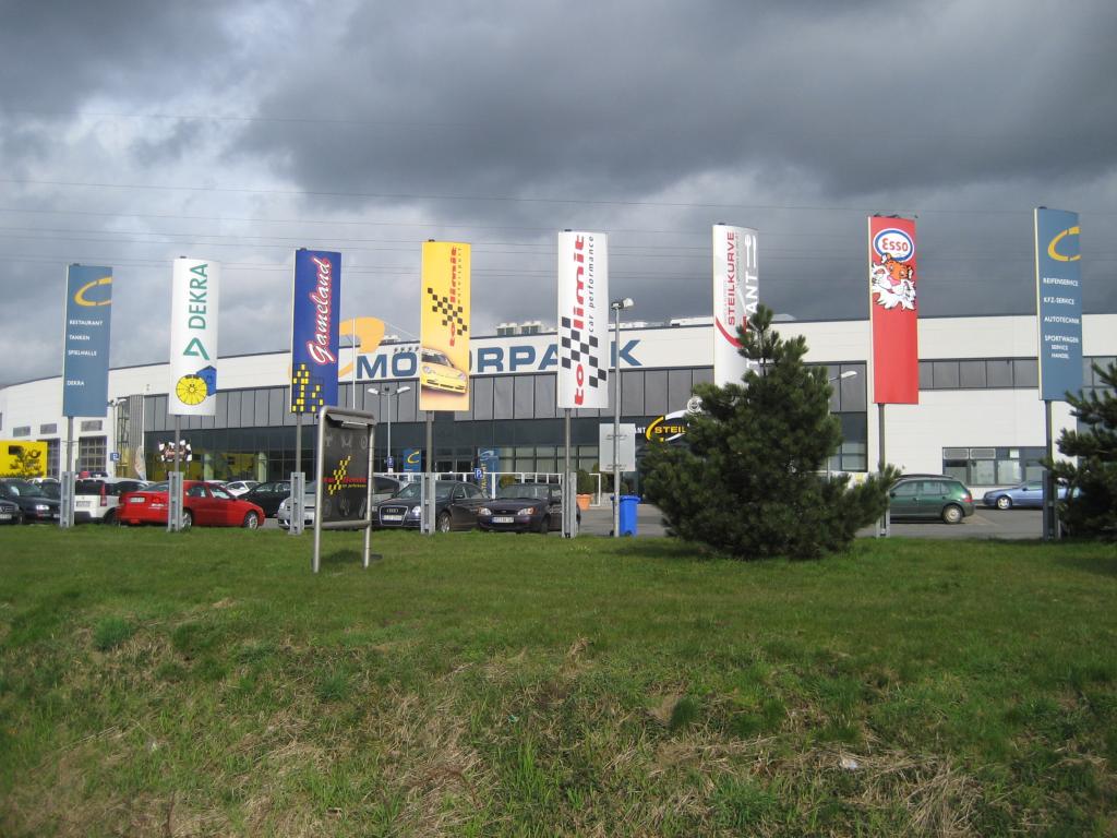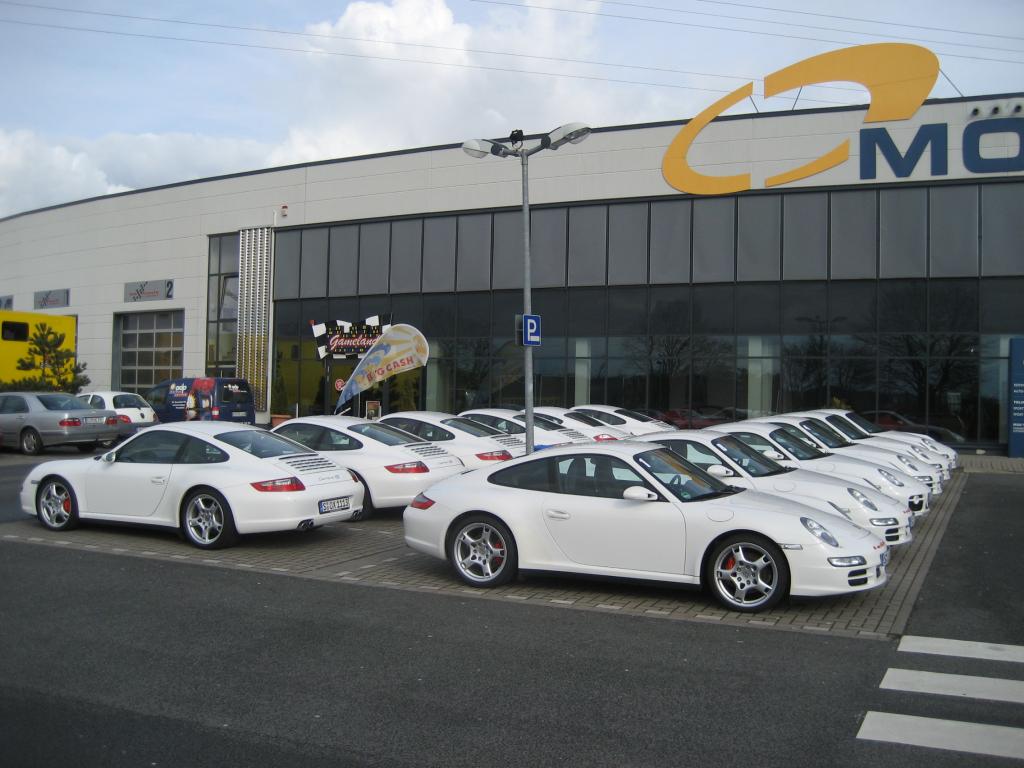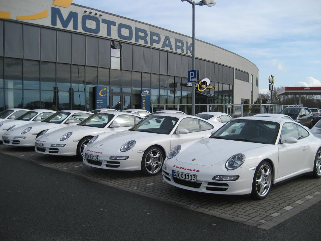 Der Marathon wird jedoch nicht direkt in Lohne gestartet, sondern am fünf Kilometer entfernten Motorpark. Dieser liegt zwar für Autofahrer sehr verkehrsgünstig an der A1, doch ist er für Bahnfahrer nicht so einfach zu erreichen. Dennoch unternehmen wir am Freitag einen Fußmarsch zum Motorpark, um uns auch diesen einmal anzuschauen. Außer einem Poster am Eingang der Raststätte Steilkurve und den Hinweisbannern an der Abbiegung in die Siemensstraße ist aber von einer Marathonveranstaltung noch nichts zu erkennen. Dafür fallen aber die 12 blitzsauberen weißen Porsche auf dem Parkplatz auf.