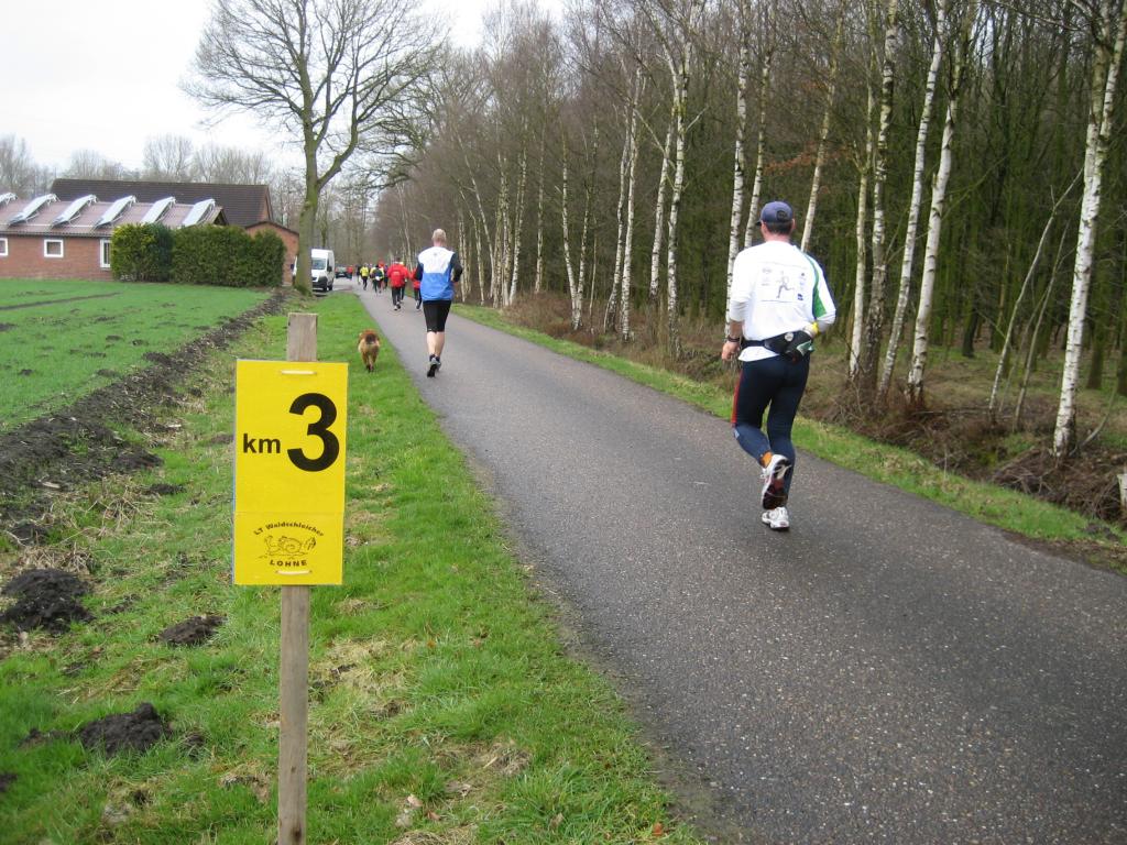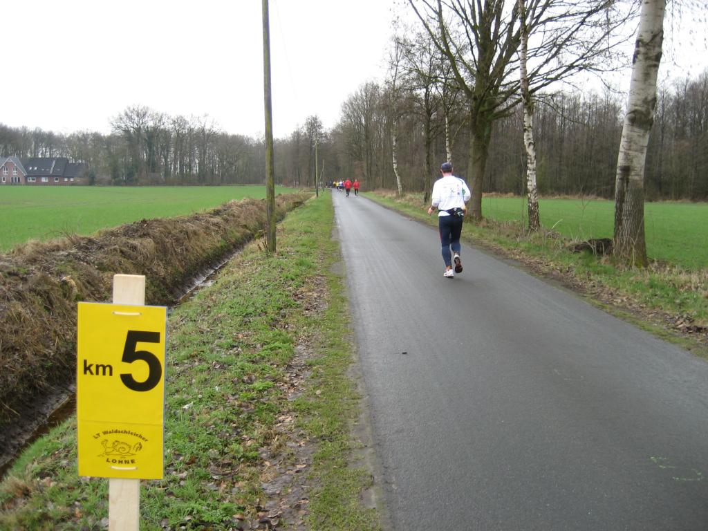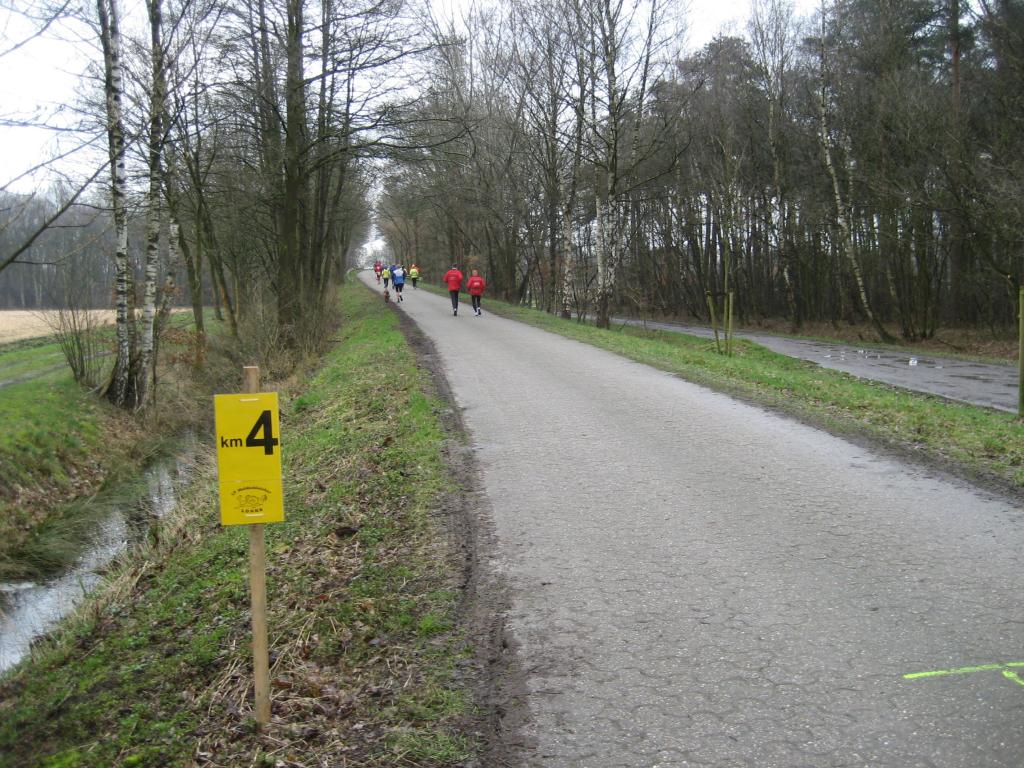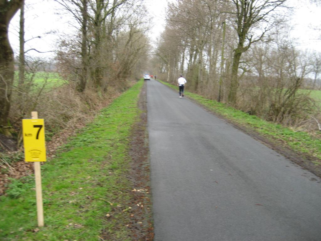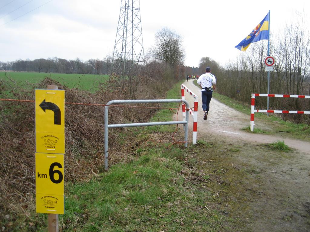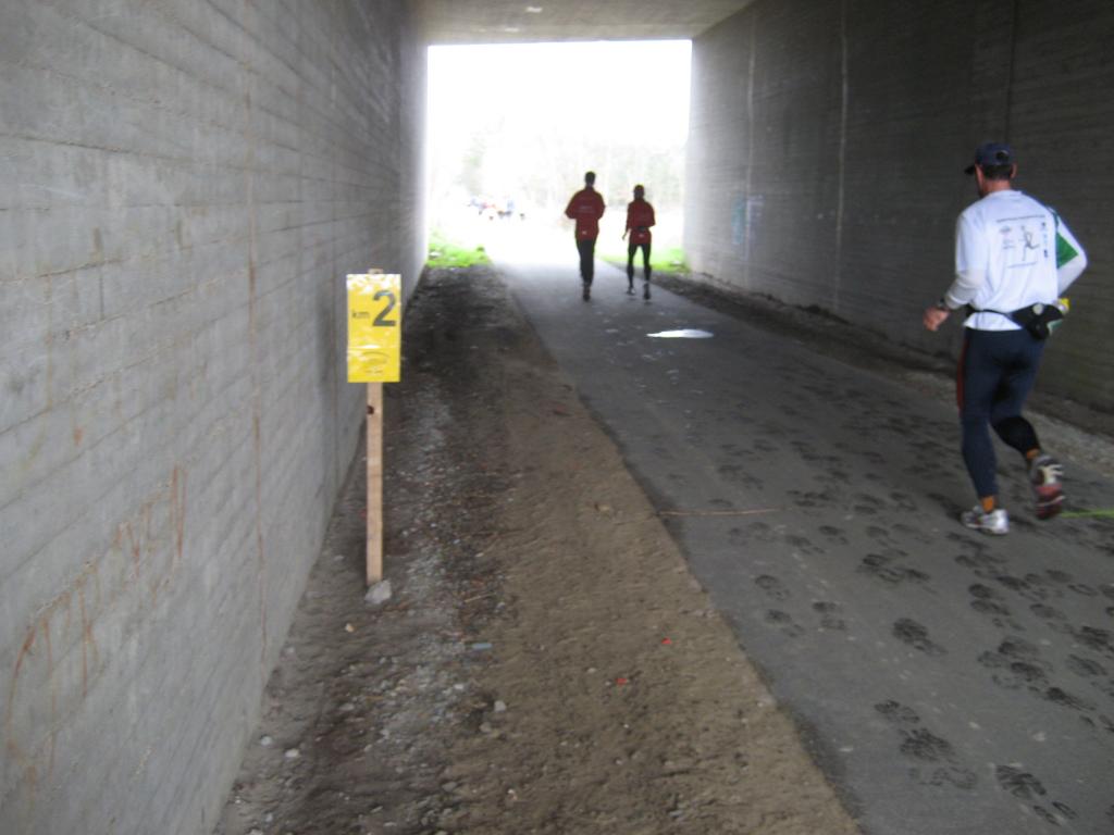 Pünktlich um 10:00 Uhr fällt der Startschuß. Mit Startnummer 716 unsere nette Chauffeurin, die als Staffelläuferin die Runde in respektablen 46 Minuten bewältigt. Die ersten rund 100 m läuft es noch auf Asphalt. Dann biegen wir nach links ab auf eine Wiese, aber es ist nur ein kurzes Stück. Dann geht es erneut nach links auf einen Feldweg. Noch vor km 1 sind wir aber wieder auf Asphalt. Es scheint heller zu werden und ich befürchte, zu warm angezogen zu sein. Wieder geht es auf einen Feldweg und bei km 2 durch eine Unterführung der Autobahn. Zur Abwechslung mal vorbei an einigen Anwesen erreichen wir km 3. Nachdem die Strecke bei km 2 unter der Autobahn hindurch führte, laufen wir bei km 4 die einzige Steigung hoch und über die Autobahnbrücke. Nach der Brücke geht es leicht bergab und nach einer Rechtskurve ist schon bald km 5 erreicht. Bei km 6 folgt wieder ein Stück Feldweg, in das wir nach rechts abbiegen. Die Läufer, die von oben kommen, haben km 7 bereits hinter sich. Nach diesem Anwesen erreiche auch ich die 7 km Marke.