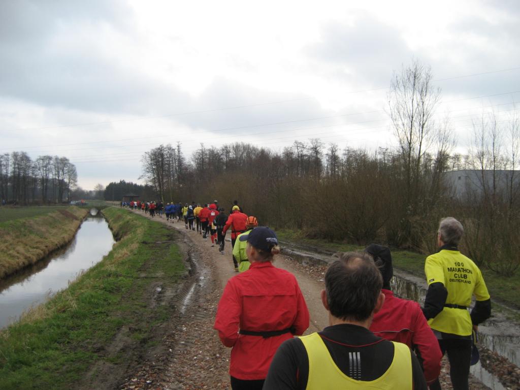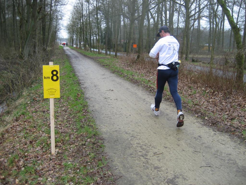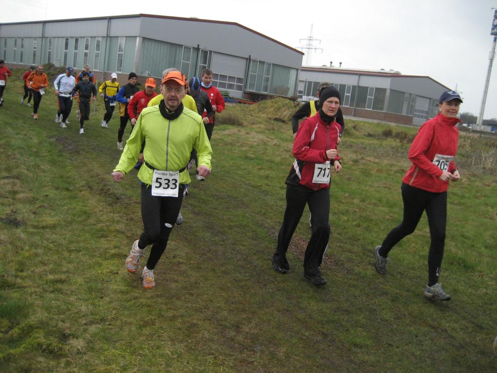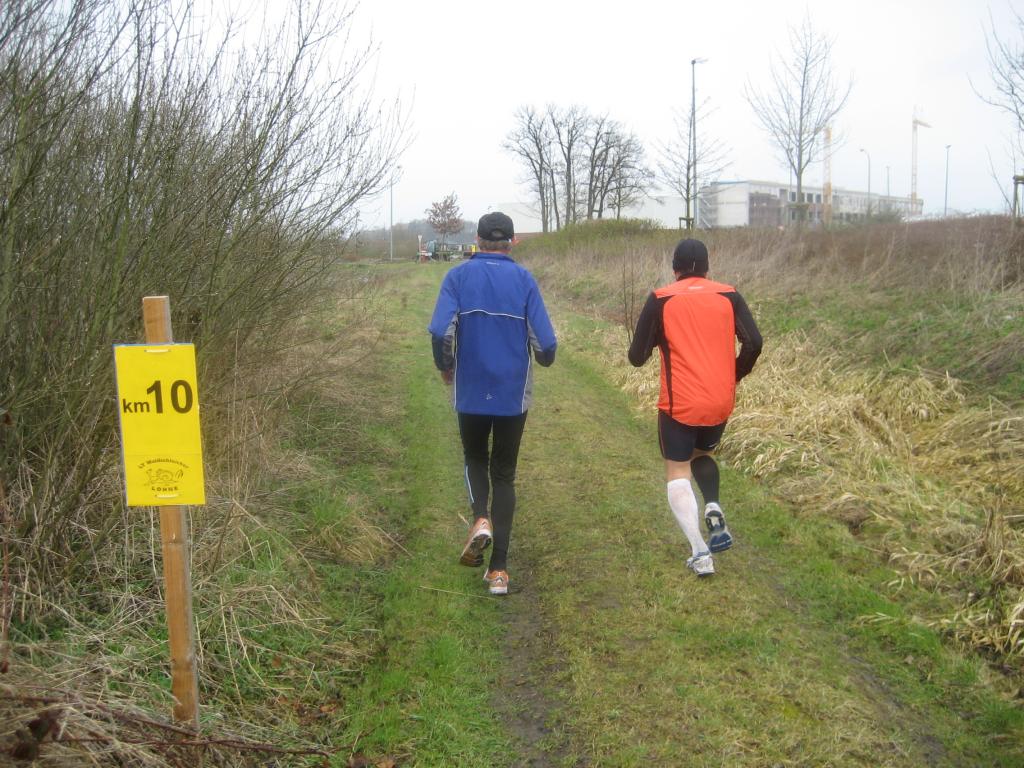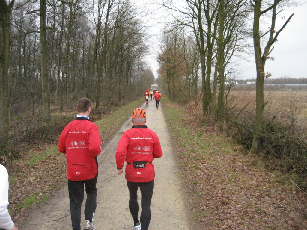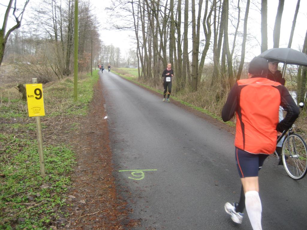 Pünktlich um 10:00 Uhr fällt der Startschuß. Mit Startnummer 716 unsere nette Chauffeurin, die als Staffelläuferin die Runde in respektablen 46 Minuten bewältigt. Die ersten rund 100 m läuft es noch auf Asphalt. Dann biegen wir nach links ab auf eine Wiese, aber es ist nur ein kurzes Stück. Dann geht es erneut nach links auf einen Feldweg. Noch vor km 1 sind wir aber wieder auf Asphalt. Es scheint heller zu werden und ich befürchte, zu warm angezogen zu sein. Wieder geht es auf einen Feldweg und bei km 2 durch eine Unterführung der Autobahn. Zur Abwechslung mal vorbei an einigen Anwesen erreichen wir km 3. Nachdem die Strecke bei km 2 unter der Autobahn hindurch führte, laufen wir bei km 4 die einzige Steigung hoch und über die Autobahnbrücke. Nach der Brücke geht es leicht bergab und nach einer Rechtskurve ist schon bald km 5 erreicht. Bei km 6 folgt wieder ein Stück Feldweg, in das wir nach rechts abbiegen. Die Läufer, die von oben kommen, haben km 7 bereits hinter sich. Nach diesem Anwesen erreiche auch ich die 7 km Marke.