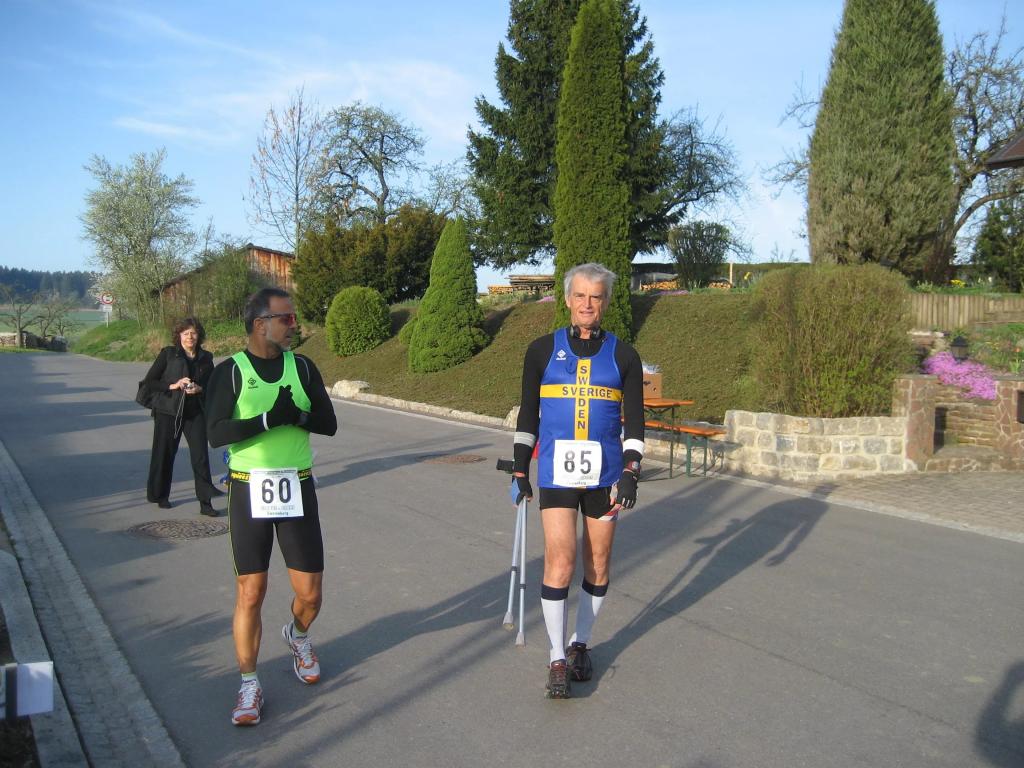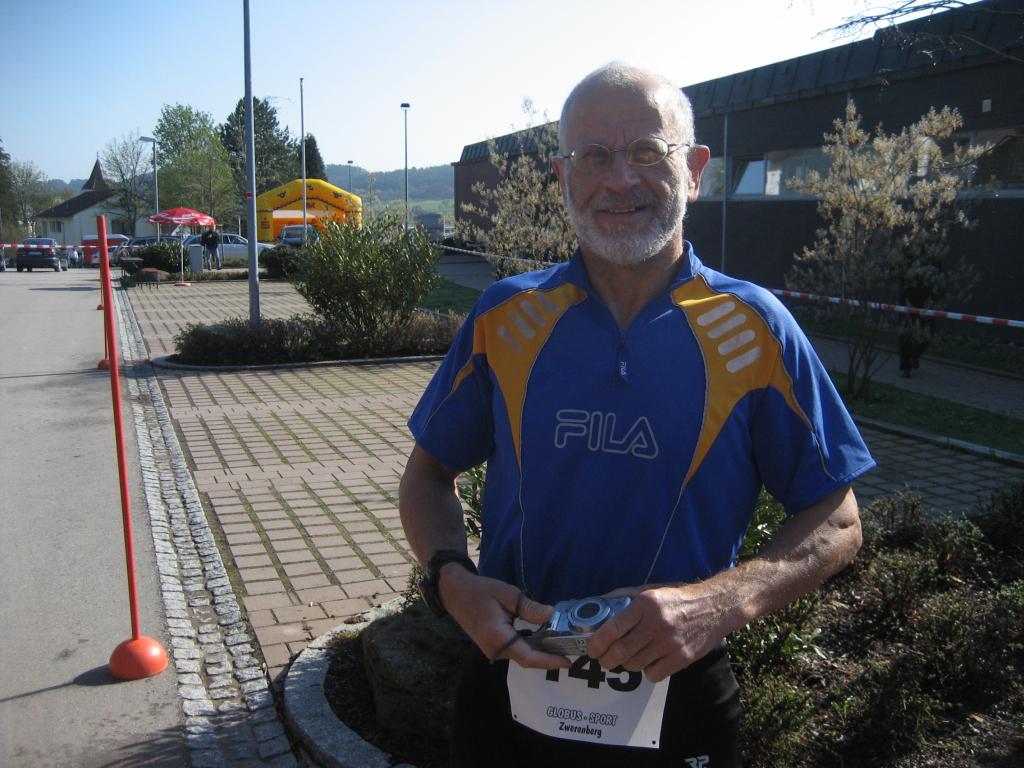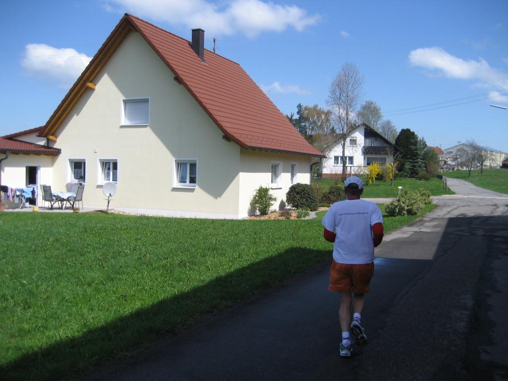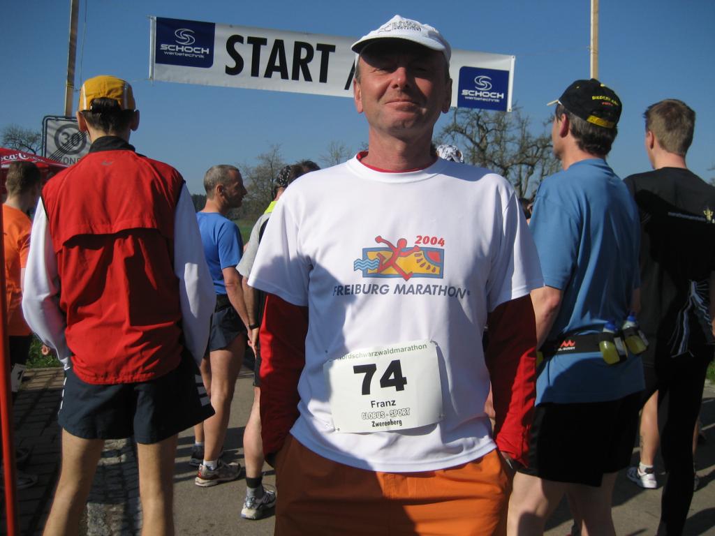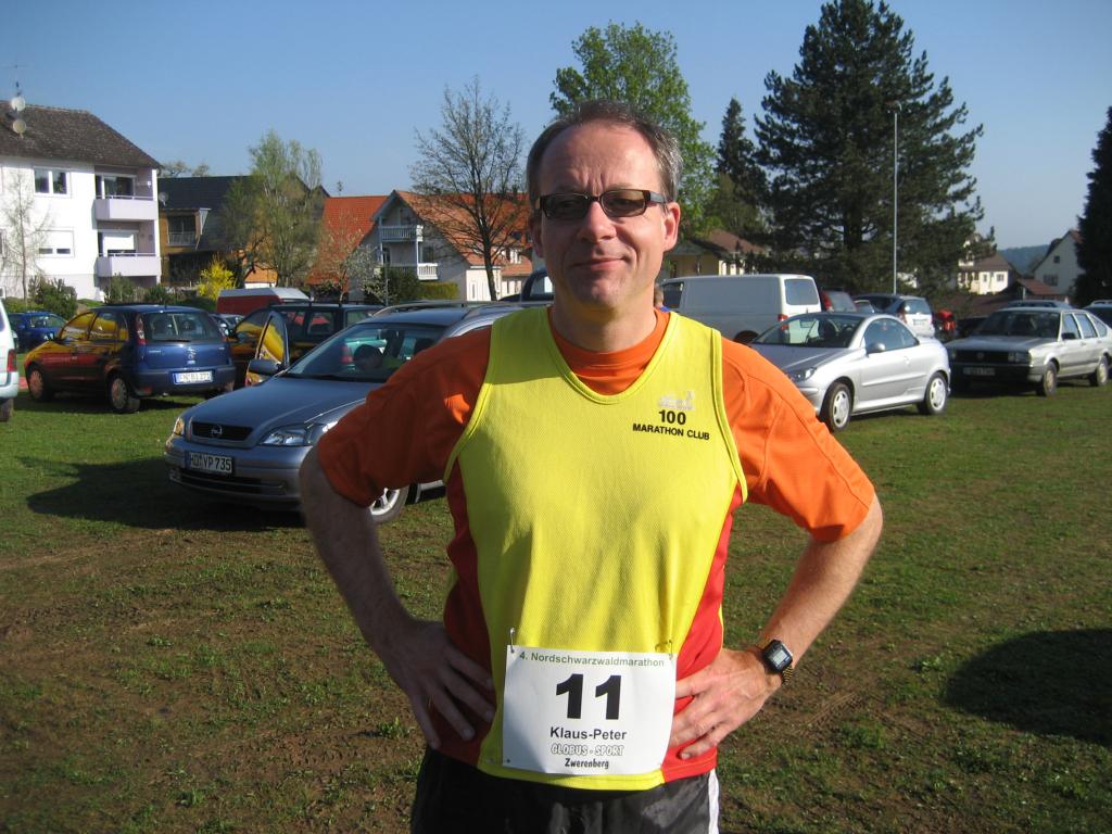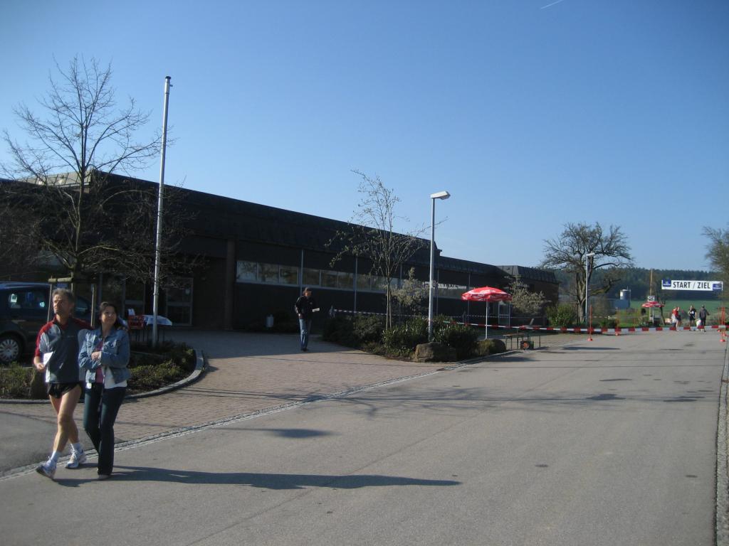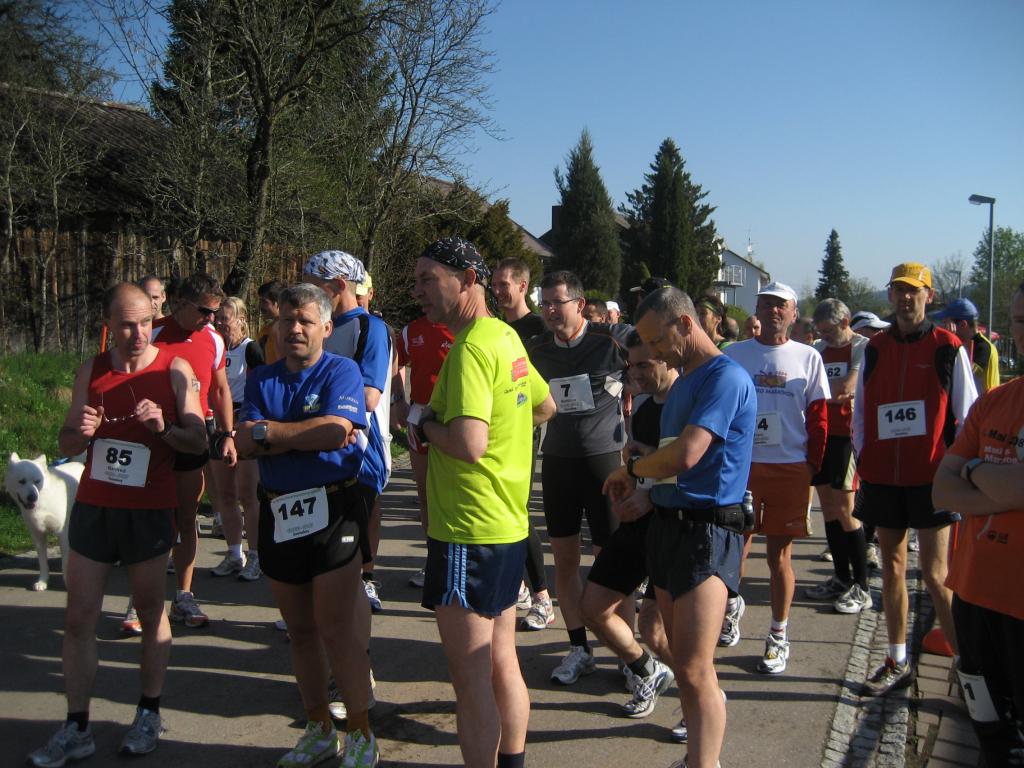 Auch die Clubmitglieder Klaus-Peter Ulmschneider und Gabriel Schlüter sind hier. Zwei Tage hatten wir in Stuttgart und sicherlich auch hier in Egenhausen, knapp 70 km von Stuttgart entfernt, fast ohne Pause Regenwetter. Doch heute hat sich der Frühling mit bestem Laufwetter zurückgemeldet, weshalb schon einige Minuten vor dem Start fast alle Teilnehmer schon draußen warten. Auch Franz Wicklein aus Stuttgart hat den Weg hierher gefunden. Inzwischen läuft er aber nicht mehr so häufig Marathon und ist daher leider aus unserem Club ausgetreten. Gabriel Schlüter ist, wie ich, mit Fotoapparat bewaffnet.