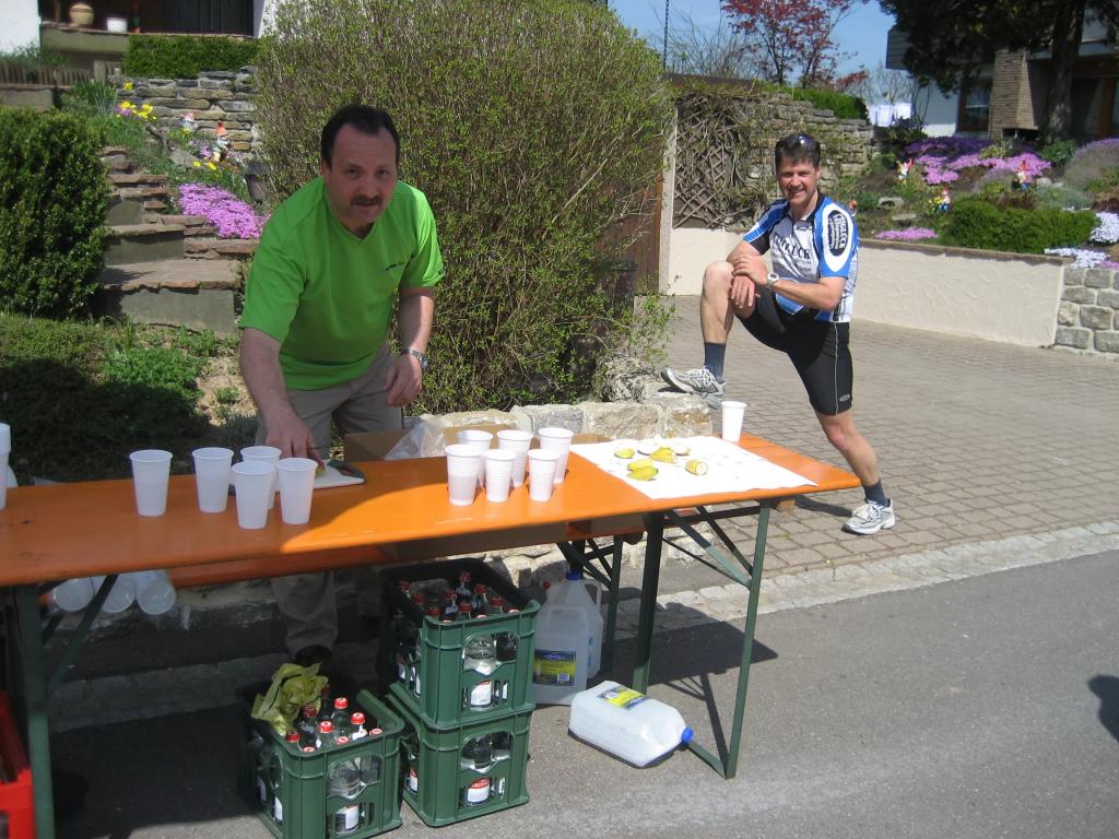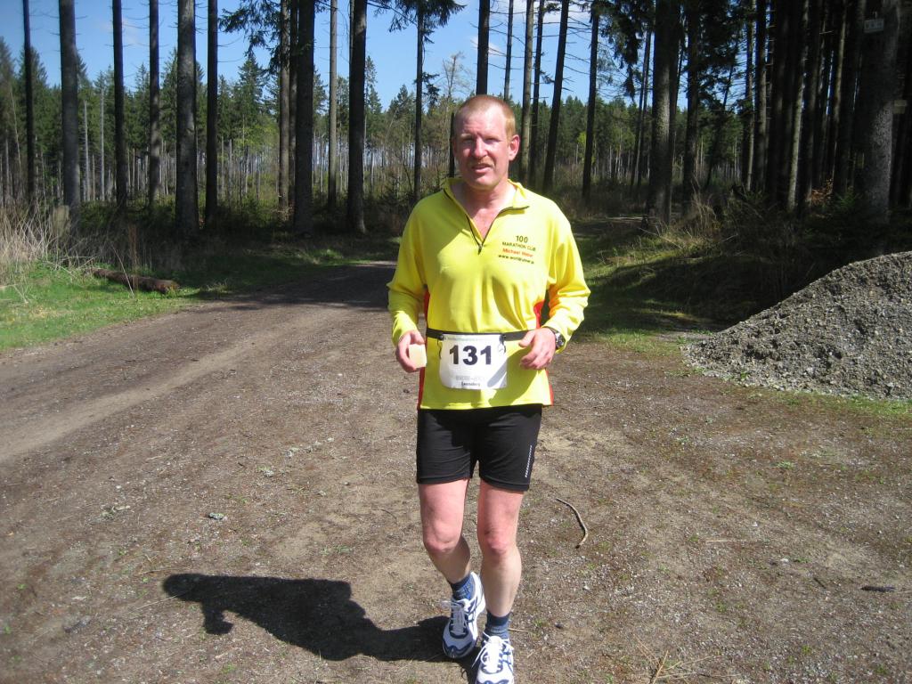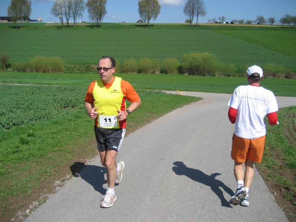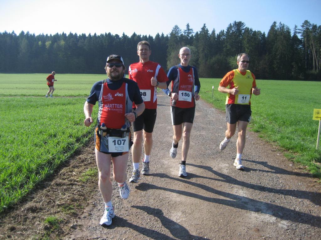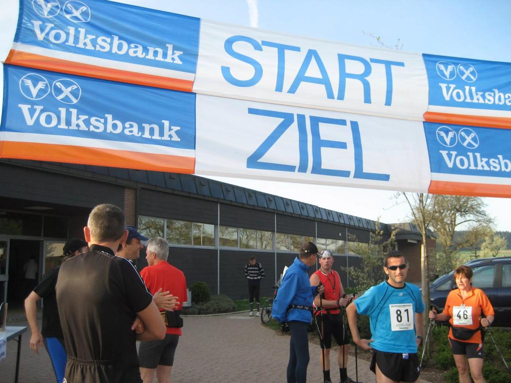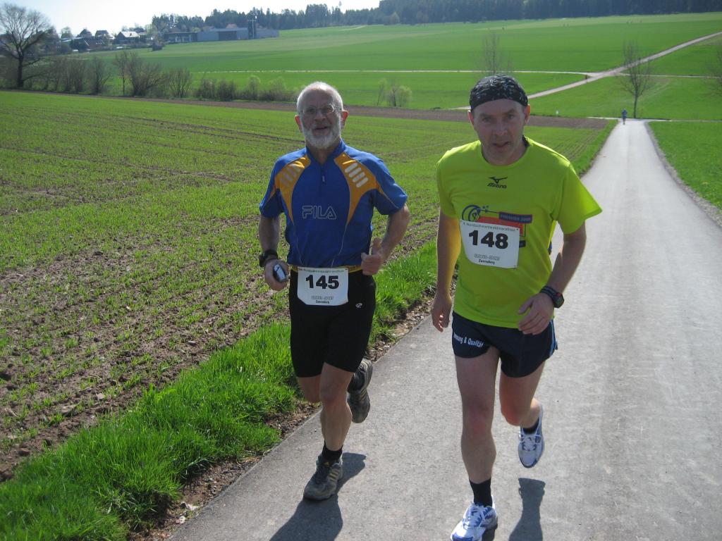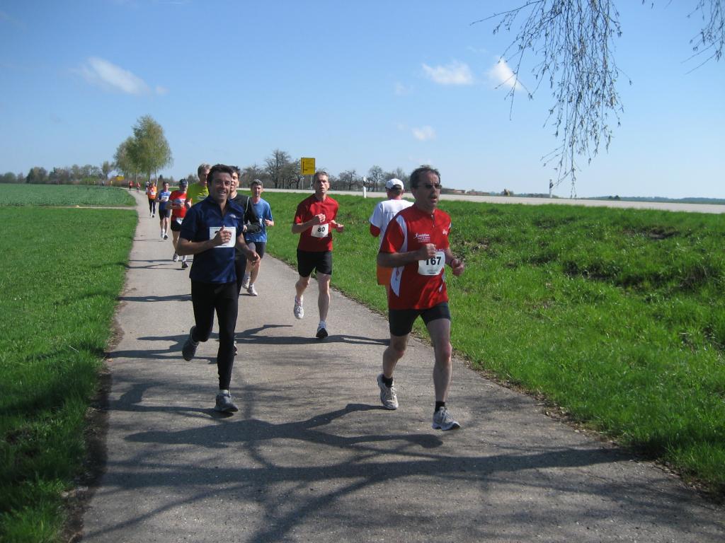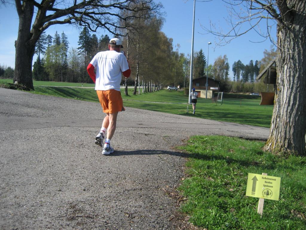 Auch die Clubmitglieder Klaus-Peter Ulmschneider und Gabriel Schlüter sind hier. Zwei Tage hatten wir in Stuttgart und sicherlich auch hier in Egenhausen, knapp 70 km von Stuttgart entfernt, fast ohne Pause Regenwetter. Doch heute hat sich der Frühling mit bestem Laufwetter zurückgemeldet, weshalb schon einige Minuten vor dem Start fast alle Teilnehmer schon draußen warten. Auch Franz Wicklein aus Stuttgart hat den Weg hierher gefunden. Inzwischen läuft er aber nicht mehr so häufig Marathon und ist daher leider aus unserem Club ausgetreten. Gabriel Schlüter ist, wie ich, mit Fotoapparat bewaffnet.