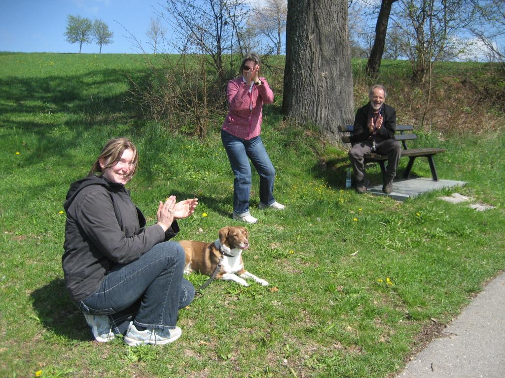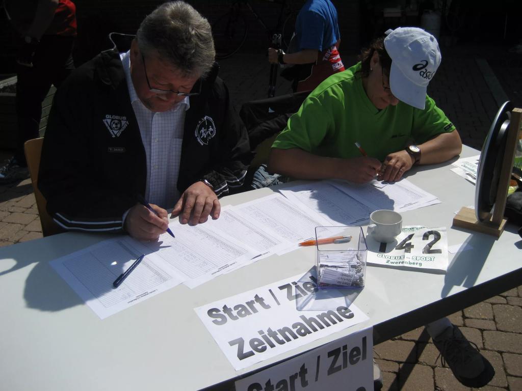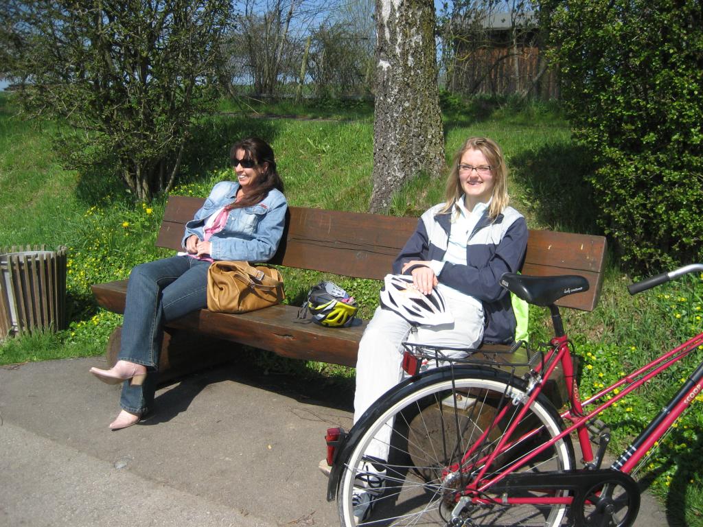 Nur ganz selten sieht man auch mal Zuschauer entlang der Strecke, wobei ich bei den beiden Damen, die hier auf der Bank sitzen, vorsichtshalber nachfrage, ob sie auch tatsächlich wegen uns Läufern hier sitzen. Bei denen, die klatschen, erübrigt sich eine solche Frage.
