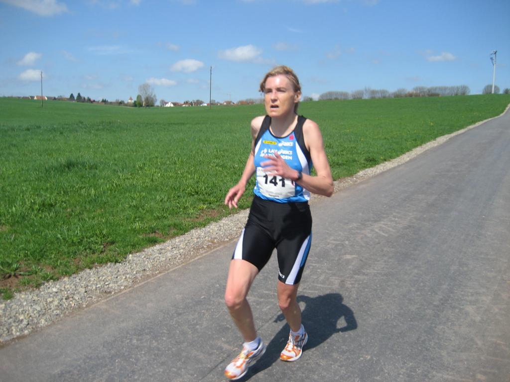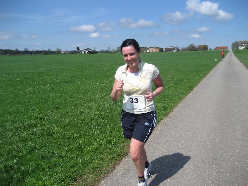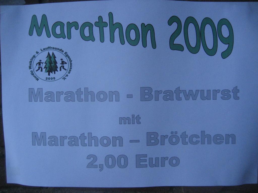 Jeder km ist aussgeschildert und ich kann auf den letzten Kilometern nur noch ein paar Walker passieren, auf dieser, alles in allem, landschaftlich sehr reizvollen Strecke. Vor der Sporthalle gibt es Marathon Bratwurst und Marathon Brötchen. Leider habe ich sie nicht probiert, kann daher auch nicht sagen, ob es spezielle Rezepte sind.