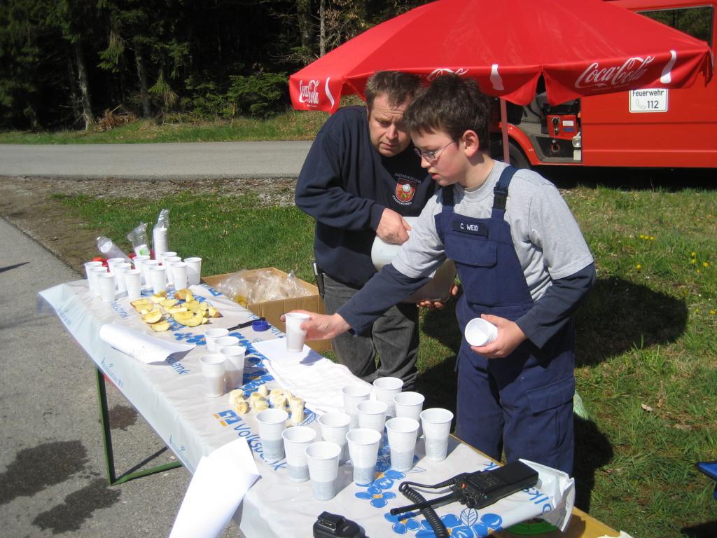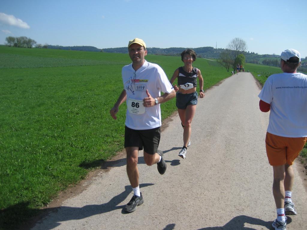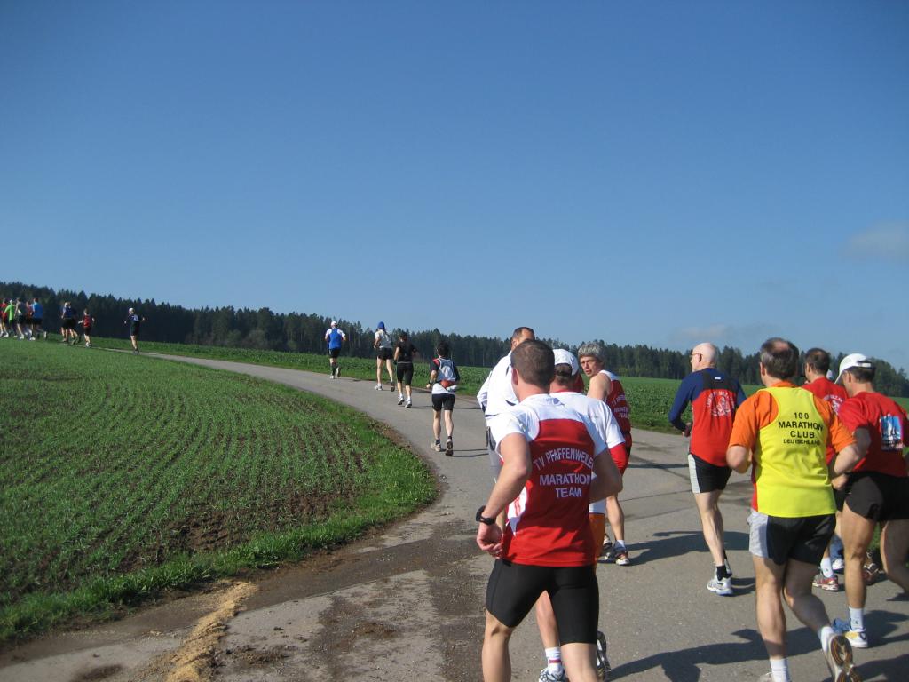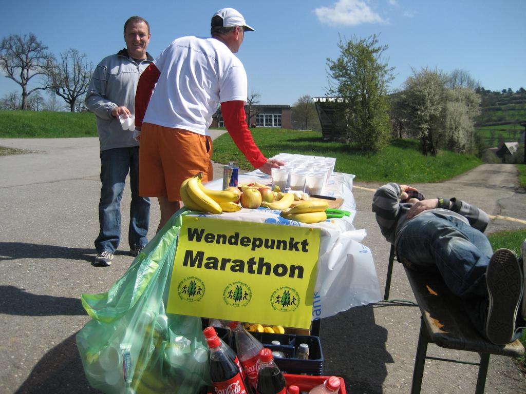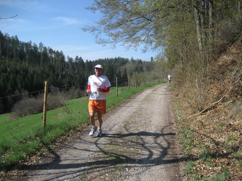 Am Ende dieser Steigung biegen wir dort, wo wir bei km 5 auf den kurzen Wiesenabschnitt kamen, wieder auf diesen Weg ein und laufen auf selber Stecke zum Start zurück. Entgegen kommen uns nun bis dorthin zunächst die später gestarteten Halb- und 11,5 km Läufer, später die Nordic Walker und Walker. Eine Runde ist die Halbmarathondistanz und so kommen uns natürlich auch die Marathonis auf ihrer zweiten Runde hier entgegen, auch Gabriel und später Klaus-Peter. Ich laufe die erste Runde zusammen mit Franz, der mir von seiner interessanten Reise zum Kilimanjaro mit Besteigung und anschließend dem Marathonlauf erzählt. Dann haben auch wir den Wendepunkt erreicht und stärken uns an der Verpflegung für die zweite Runde. Gut, die Schnellsten sind wir beide nicht, aber dem Verpflegungsposten ist die Steherei wohl inzwischen zu anstrengend und er liegt gemütlich auf seiner Bank.