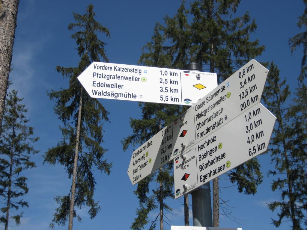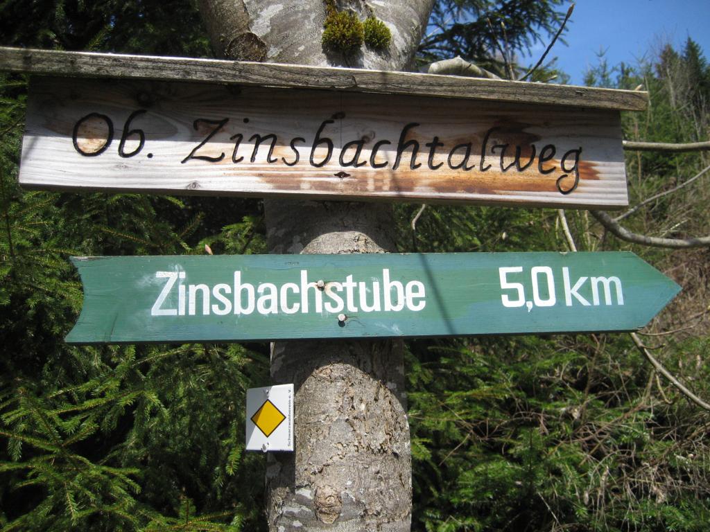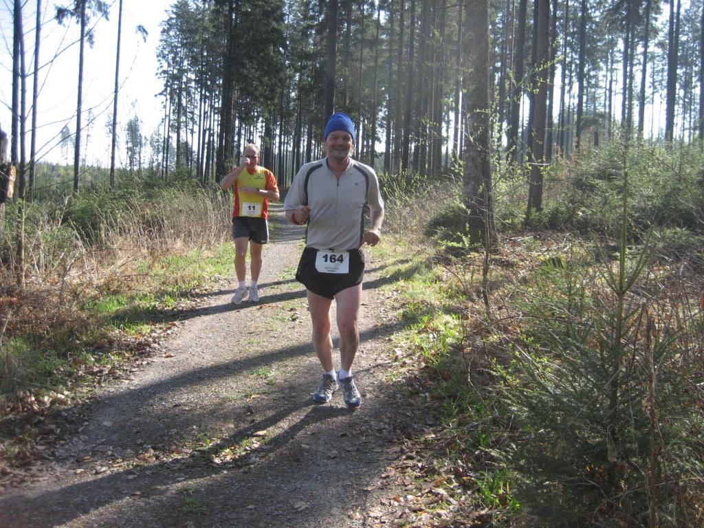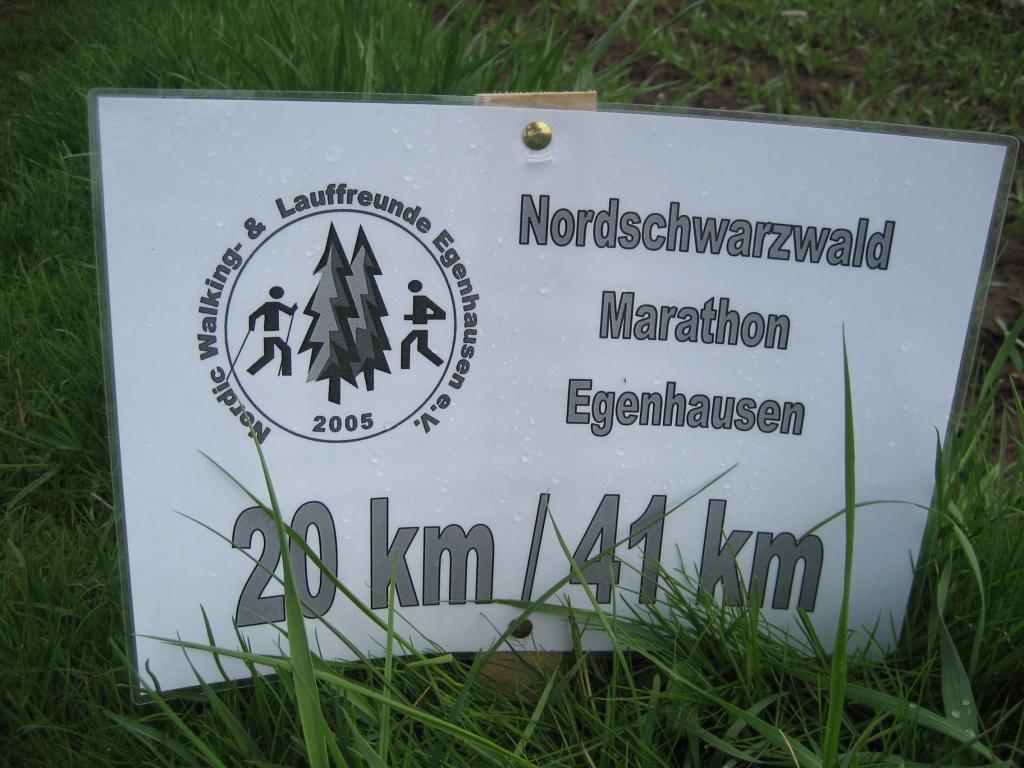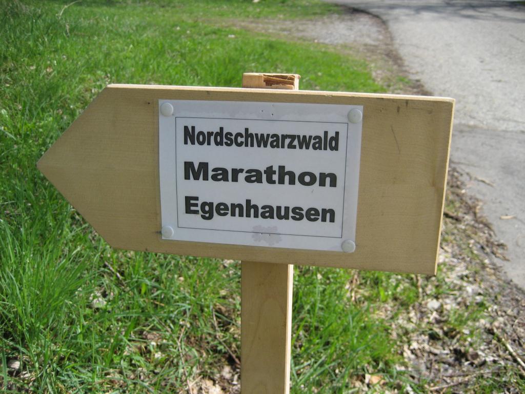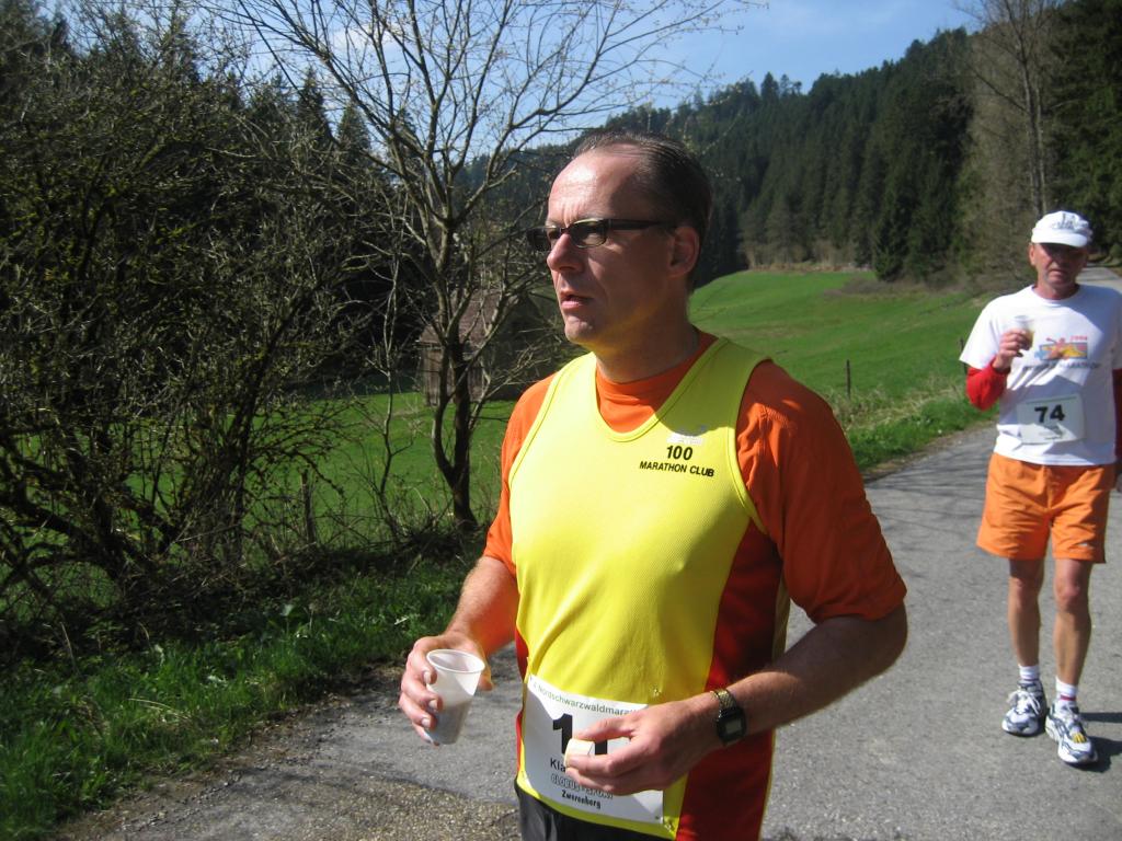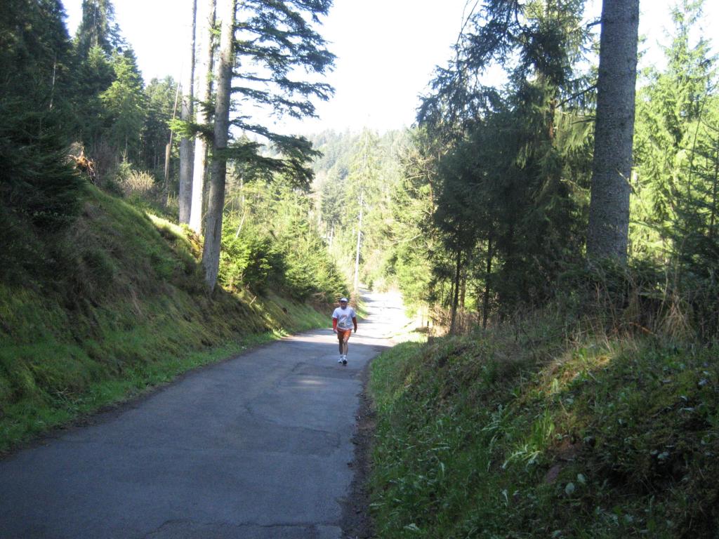 Zunächst geht es ein paar Meter bergab, dann wird es auf asphaltierten Feldwegen, die wir im Zickzack belaufen, etwas wellig. Die Streckenposten sind mit Tisch, Bank, Stuhl und Schirm jeweils sehr gut ausgestattet. Hauptsächlich sind sie an den Straßenüberquerungen zu finden. Auf den Feldwegen und später im Wald stehen ausreichend kleine Schildchen, die den richtigen Weg weisen. Bevor es nach km 5 in den Wald geht, laufen wir noch rund 100 Meter über eine Wiese. Der längste und schönste Teil der Strecke führt durch den Nordschwarzwald. Auf einem kurzen Streckenabschnitt stehen Holzkopf-Skulpturen am Rande der Strecke. Häufig gibt es im Wald Wegweiser in viele Richtungen. Pfalzgrafenweiler, bekannt vom 100 km Lauf, liegt ganz in der Nähe. Nach einem steilen Bergabstück geht es über eine kleine Brücke über den Zinsbach. Kurze Steigung, Verpflegungsstation bei ca. km 10 und dann 5 km relativ eben in Richtung der Zinsbachstube. Kurz nach dem Wegweiser ein Fledermauskeller. Verschlossenes Gitter, aber Fledermäuse kommen da sicherlich durch. Sehr angenehm läuft es sich auf diesem Abschnitt bis zur Verpflegung bei km 15. An den Verpflegungen gibt es jeweils Wasser, Tee und Cola, dazu Apfel- und Bananenstücke. Dann geht es kurz vor der Zinsbachstube rechts hinunter und danach kommt eine gut einen Kilometer lange Steigung, die Franz und ich in großen Teilen gehen. Klaus-Peter läuft diese und kann sich so absetzen.
