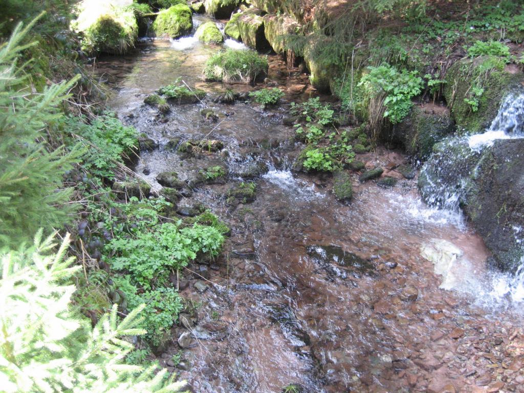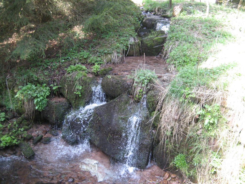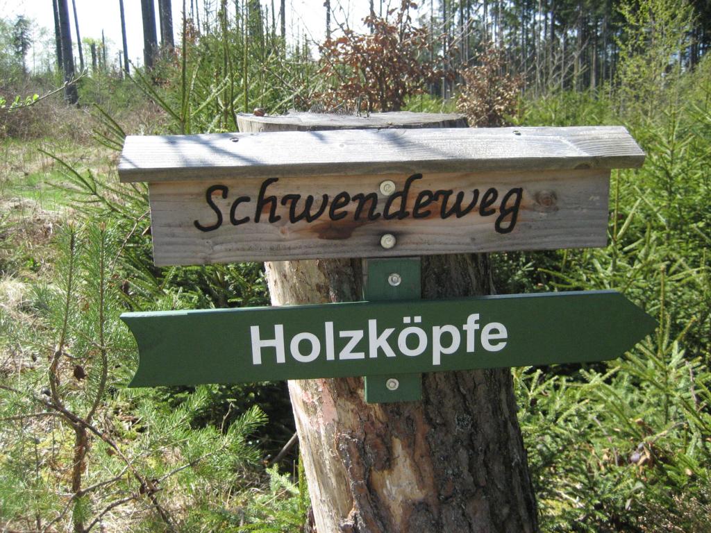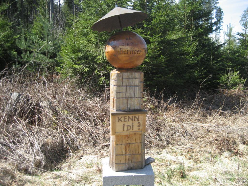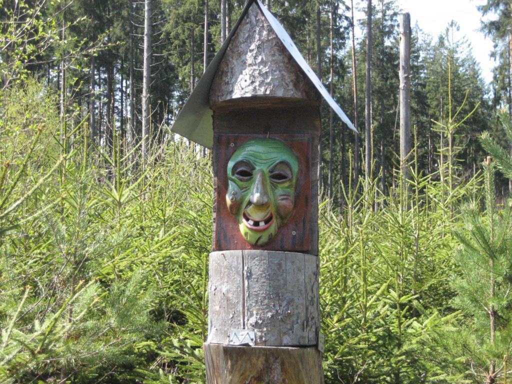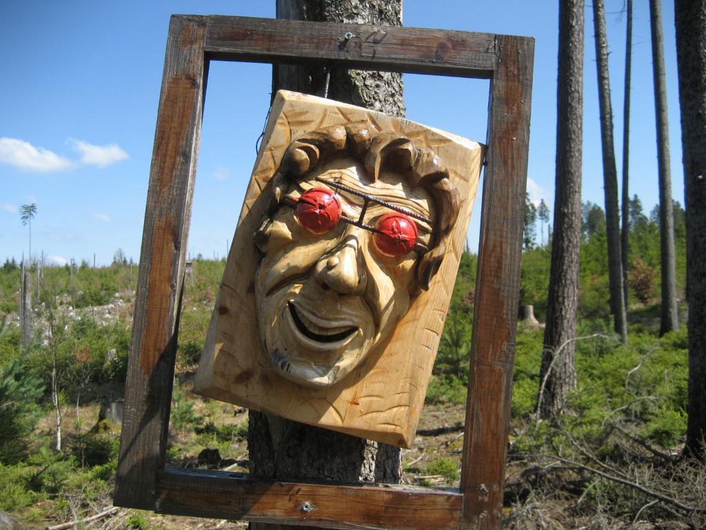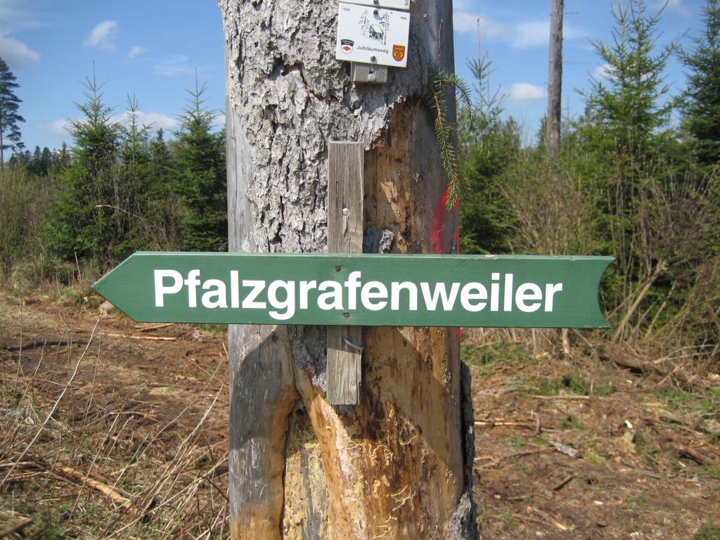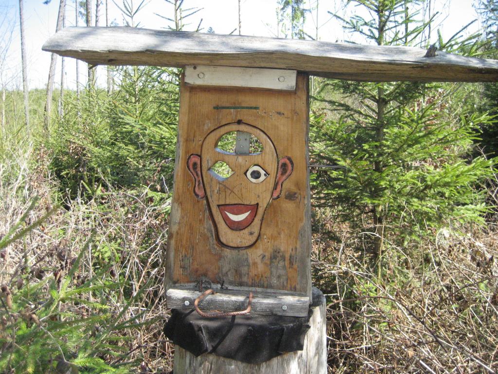 Zunächst geht es ein paar Meter bergab, dann wird es auf asphaltierten Feldwegen, die wir im Zickzack belaufen, etwas wellig. Die Streckenposten sind mit Tisch, Bank, Stuhl und Schirm jeweils sehr gut ausgestattet. Hauptsächlich sind sie an den Straßenüberquerungen zu finden. Auf den Feldwegen und später im Wald stehen ausreichend kleine Schildchen, die den richtigen Weg weisen. Bevor es nach km 5 in den Wald geht, laufen wir noch rund 100 Meter über eine Wiese. Der längste und schönste Teil der Strecke führt durch den Nordschwarzwald. Auf einem kurzen Streckenabschnitt stehen Holzkopf-Skulpturen am Rande der Strecke. Häufig gibt es im Wald Wegweiser in viele Richtungen. Pfalzgrafenweiler, bekannt vom 100 km Lauf, liegt ganz in der Nähe. Nach einem steilen Bergabstück geht es über eine kleine Brücke über den Zinsbach. Kurze Steigung, Verpflegungsstation bei ca. km 10 und dann 5 km relativ eben in Richtung der Zinsbachstube. Kurz nach dem Wegweiser ein Fledermauskeller. Verschlossenes Gitter, aber Fledermäuse kommen da sicherlich durch. Sehr angenehm läuft es sich auf diesem Abschnitt bis zur Verpflegung bei km 15. An den Verpflegungen gibt es jeweils Wasser, Tee und Cola, dazu Apfel- und Bananenstücke. Dann geht es kurz vor der Zinsbachstube rechts hinunter und danach kommt eine gut einen Kilometer lange Steigung, die Franz und ich in großen Teilen gehen. Klaus-Peter läuft diese und kann sich so absetzen.