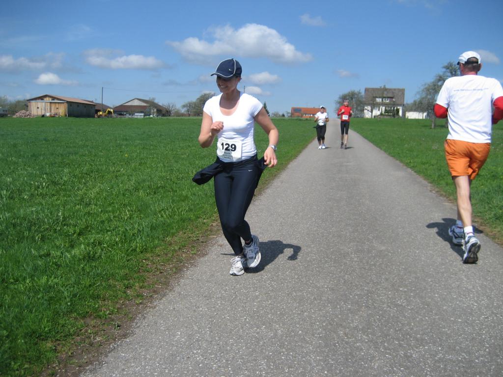 Auf dem Feldwegabschnitt kommen uns nun bereits wieder die 11,5 km Läuferinnen und Läufer entgegen und später auch schon die ersten Halbmarathonläufer.