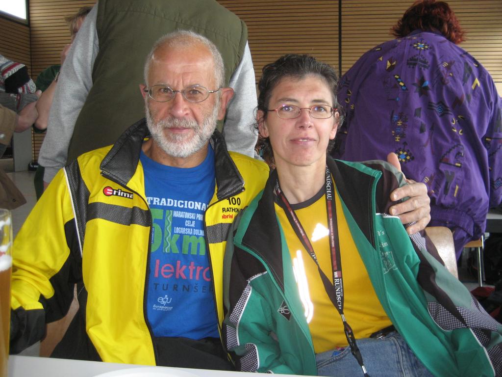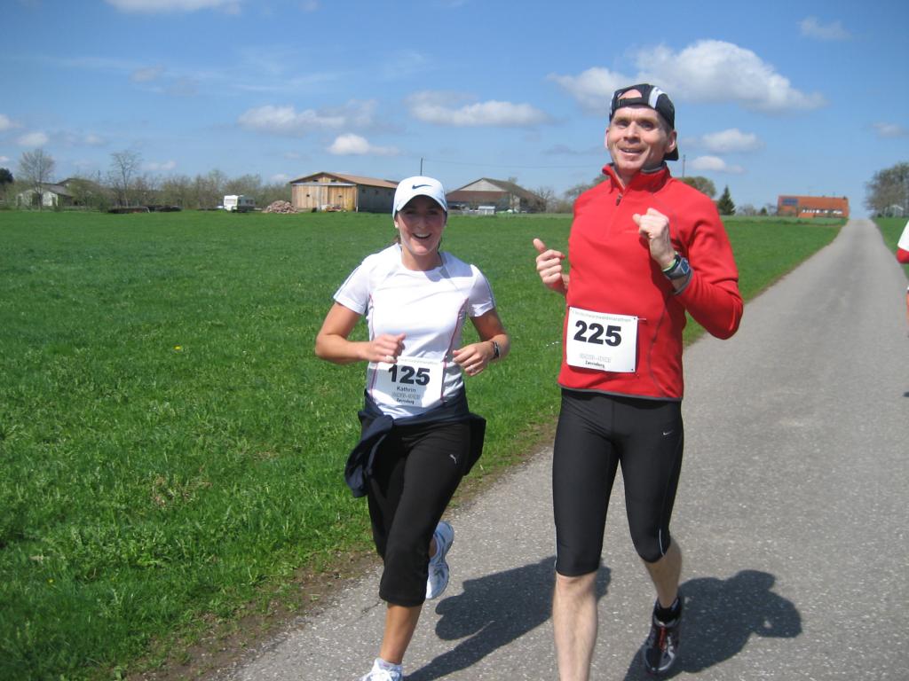 In der Halle treffe ich auch Eva Schlüter, die auch im Marathon teilgenommen hat. Eva und Gabriel hatten erst am 30. Januar geheiratet und verlegten ihre "Hochzeitsreise" tags drauf auf den 50 km Lauf von Rodgau (siehe Bericht vom 26.03.2009).