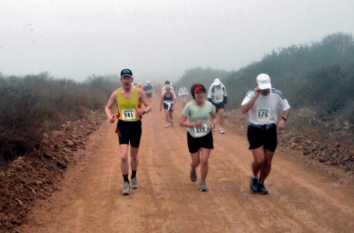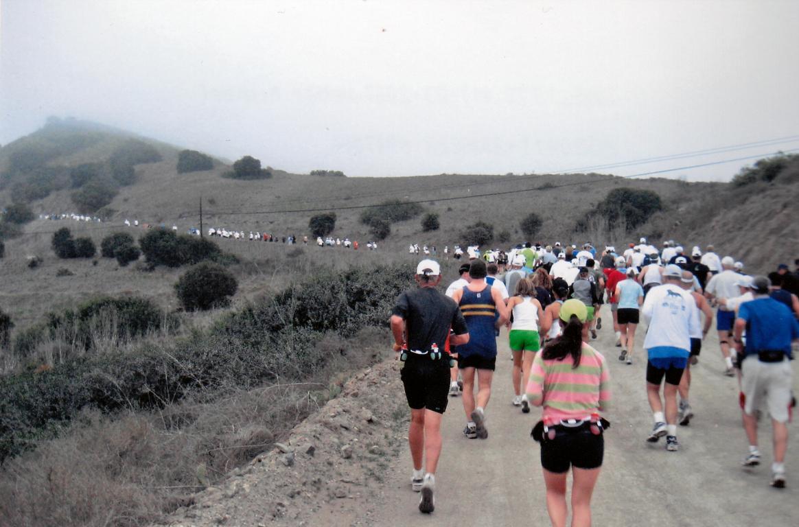 Der Start ist um 7:00 Uhr und der Himmel ist noch wolkenverhangen. Die Strecke ist bergig und schon nach wenigen hundert Metern geht es die erste lange Steigung hinauf. Noch laufen die meisten, aber schon bei der nächsten Steigung gehen viele. Wir sind jetzt mitten in den Wolken drin und die Sicht beträgt manchmal keine 100 Meter. Es geht nur rauf und runter, wie auf einer Achterbahn, aber dieser reine Landschaftsmarathon auf Naturwegen macht Spaß. Nach 2:23 Stunden passiere ich die Halbmarathonmarke. Ab jetzt wird das Profil flacher. Man kann bis nach Meile 17 (Kilometerangaben gibt es nicht) jetzt sehr gut laufen, auch wenn es immer leicht ansteigt. Inzwischen zeigt sich die Sonne, es wird aber noch nicht warm, insgesamt beste Laufbedingungen. Bis Meile 18 gehe ich wieder ein Stück. Ich fühle mich noch frisch und nehme ab jetzt auch die restlichen Steigungen im Laufschritt. Bei Meile 22 erreichen wir mit über 480 Metern den höchsten Punkt der Strecke. Ab hier geht es jetzt nur noch bergab, zum Teil sehr kräftig, bis zum Ziel in Avalon auf Meereshöhe.