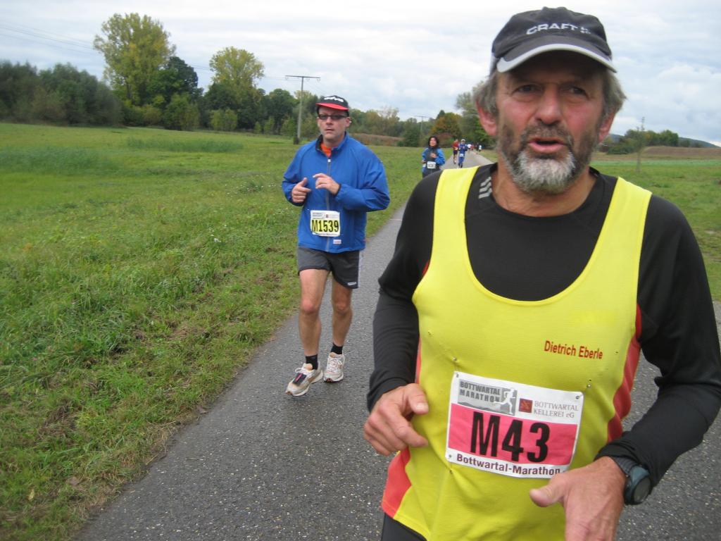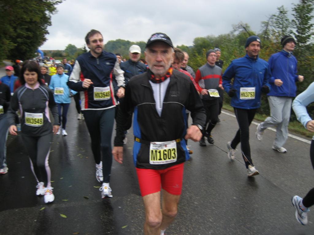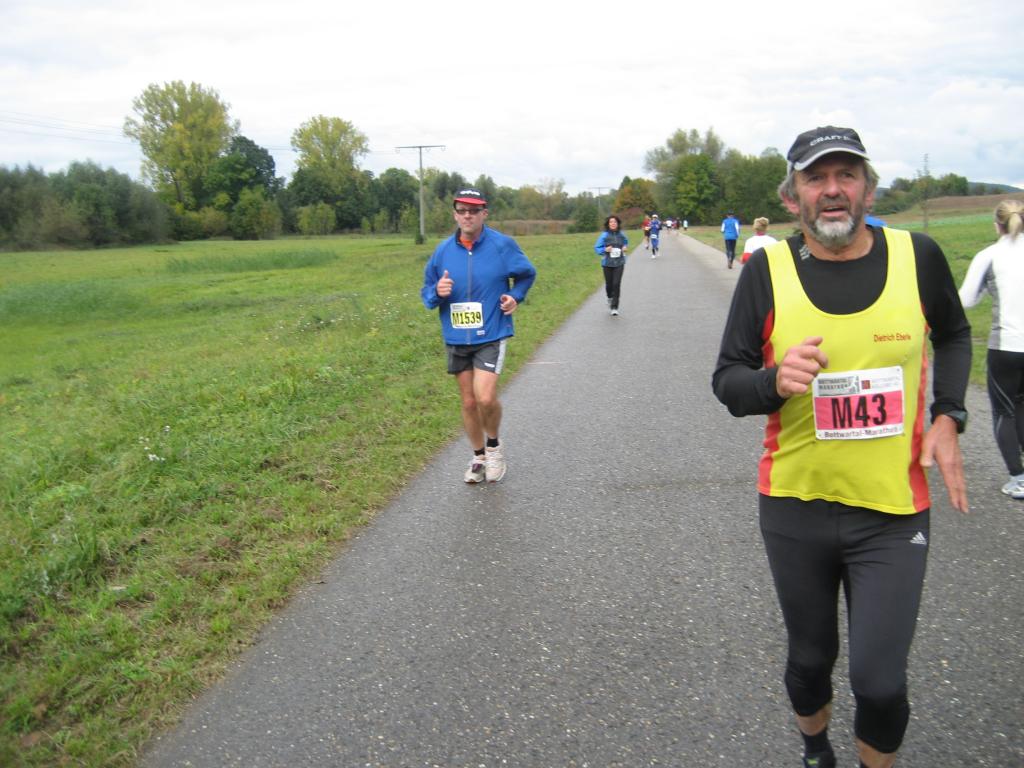 Auf der 2. Runde, der Südschleife treffe ich Klaus-Peter Ulmschneider und Dietrich Eberle. Ich befürchtete einen totalen Einbruch nach dieser strammen ersten Hälfte, doch es lief recht gut weiter, so dass ich unterwegs sogar alle unter 100 Marathon Club gemeldeten Läufer einfangen konnte. Bei km 36 mit Ulrich Tomaschewski. Bei km 40 kontrollierte ich noch schnell meinen Ziel-60 Spickzettel. Eine 4:23 oder 4:24 durfte es nicht werden, ansonsten gab es davor und danach genug Luft. Ich mobilisierte die letzten Kräfte, musste aber 50 Meter vor dem Ziel erkennen, dass die 4:22 in diesem Moment vorüber war, so dass ich leider zwei Minuten auf eine passende Zeit warten musste, was eine Gesamtplatzierung unter den ersten 400 (von 477) Männern im Marathon damit verhinderte (62 weibliche Finisher).
