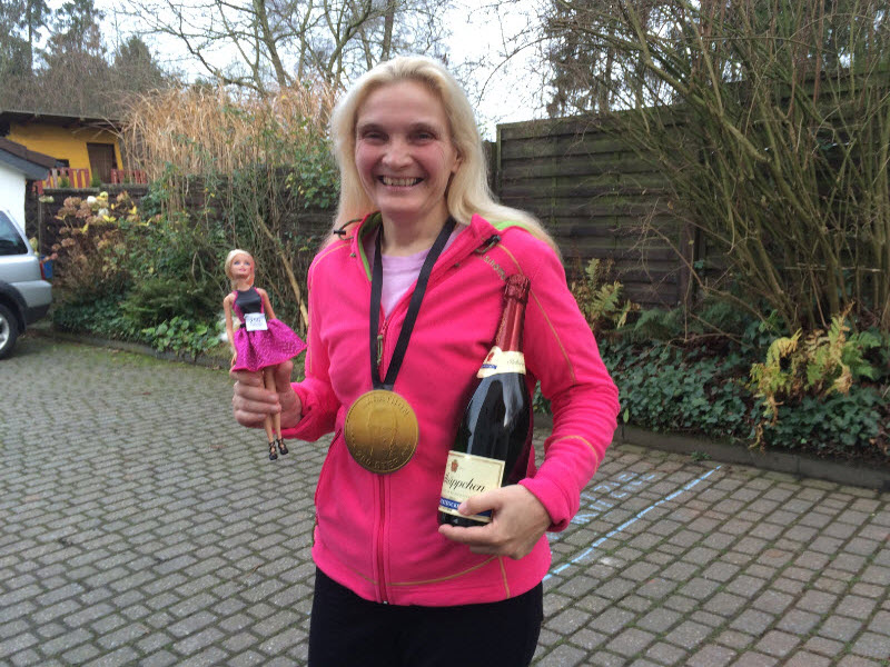 Von Peer und Andreas bekam Claudia die berühmte Barby Puppe für den 250. Marathon.